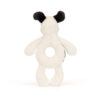 Keep little paws busy with the Bashful Black & Cream Puppy Ring Rattle. With four squashy paws. adorable perky black ears and a gentle rattle which delights at every shake. Crafted in the softest fur made from recycled fibres. our much loved Bashful character pup is both a toy and comforting companion. ready to soothe and entertain at any given moment!